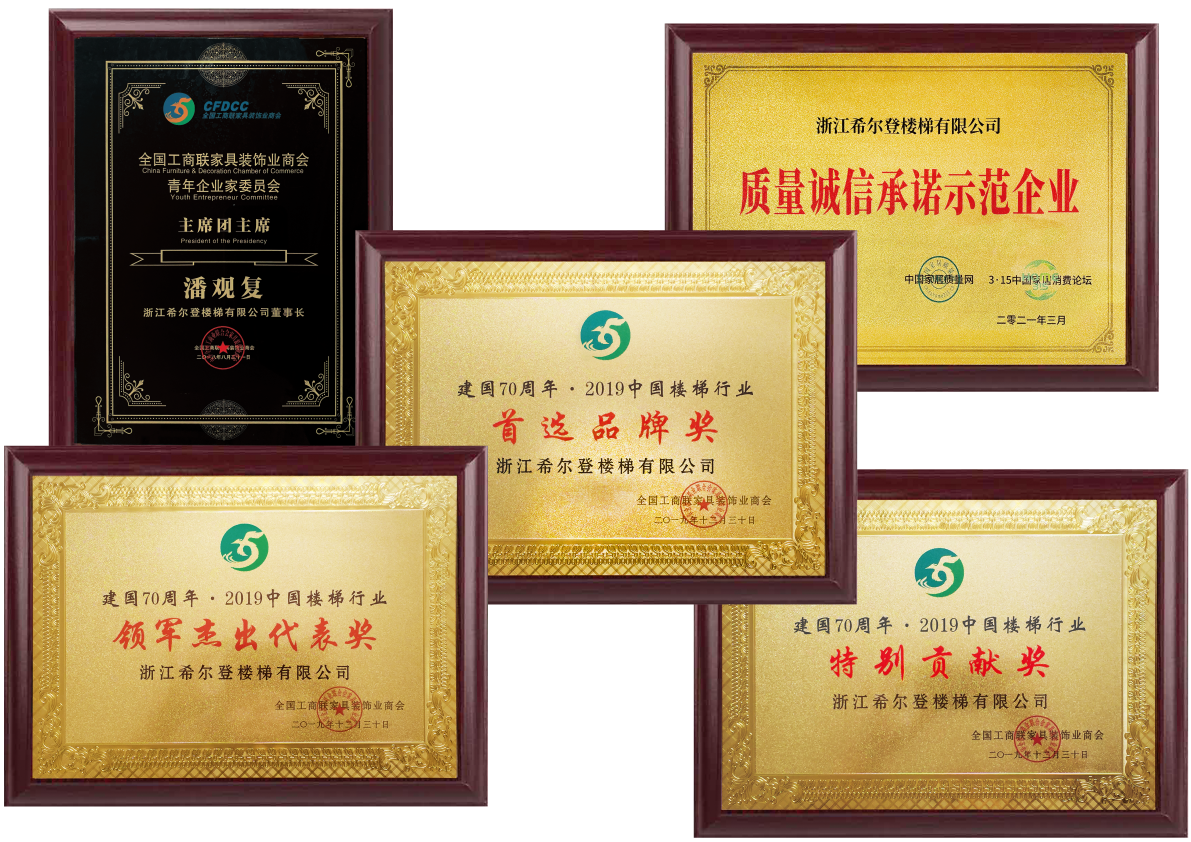 在不斷提升希爾登品牌和企業(yè)實力的同時,希爾登一直熱心參與樓梯行業(yè)的健康發(fā)展;參與創(chuàng)立全國工商聯樓梯專委會并被推選為中國樓梯品牌聯盟執(zhí)行主席和樓梯專委會執(zhí)行會長;憑借在行業(yè)內的專業(yè)地位,希爾登參與了《木質樓梯》,《木質樓梯安裝驗收和使用規(guī)范》,《住宅內用樓梯》,《建筑用玻璃與金屬護欄》四個國家和行業(yè)標準的起草工作。先后榮獲“中國樓梯十大品牌”、“金木樓梯領軍品牌”、“中國泛家居發(fā)展中企業(yè)500強”、“中國家裝行業(yè)金鉆獎”、“金屬木質樓梯一級資質”等二十多個榮譽和稱號。我們幾乎參與和見證中國樓梯發(fā)展歷程中的所有重大事件。希爾登過去,現在和未來都是中國樓梯的標桿企業(yè)。